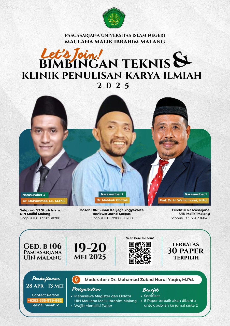 Dalam rangka meningkatkan keterampilan publikasi ilmiah, Pascasarjana UIN Maulana Malik Ibrahim Malang akan menyelenggarakan Bimbingan Teknis dan Klinik Penulisan Karya Ilmiah.