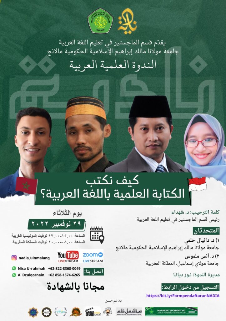 Batu, 15 desember 2022. Masih dalam rangkaian kegiatan konferensi ilmiah internasioanal studi bahasa Arab atau al-multaqa al-‘ilmi al-‘alami li ad-dirasaat al-‘arabiyah (MAYADA), pada hari kedua dilakukan sesi pararel. Terdapat tiga rumpun materi yang diangkat yaitu linguistik Arab, sastra Arab dan pembelajaran bahasa Arab. Adapun subtema yang dibahas yaitu: اللغة العربية
