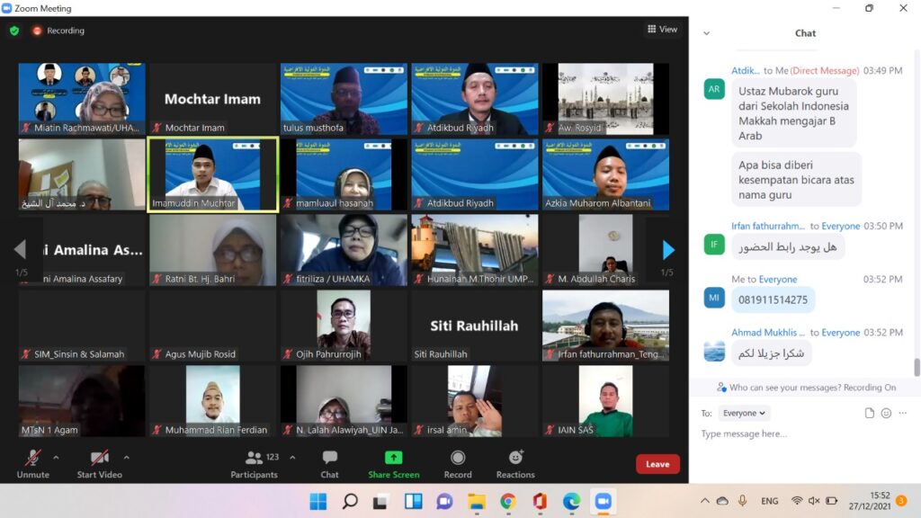 Senin (27/12/2021). Dalam rangka merayakan Hari Bahasa Arab Internasional yang diperingati setiap tanggal 18 Desember, UIN Maulana Malik Ibrahim Malang menggelar Webinar Internasional dengan tema “Inovasi Pendidikan Bahasa Arab Pasca Pandemi Covid-19”, Bekerjasama dengan Atase Pendidikan dan Kebudayaan (Atdikbud) Riyadh, King Saud University, Ikatan Pengajar Bahasa Arab Indonesia (IMLA), dan