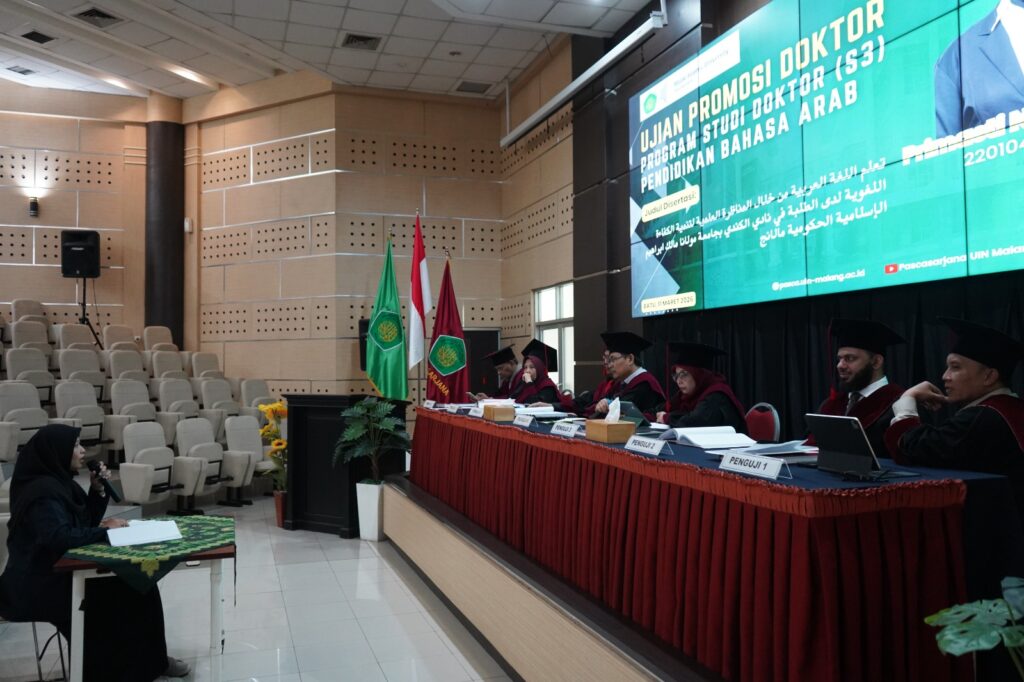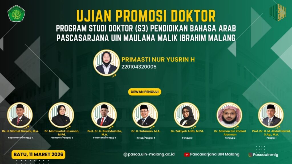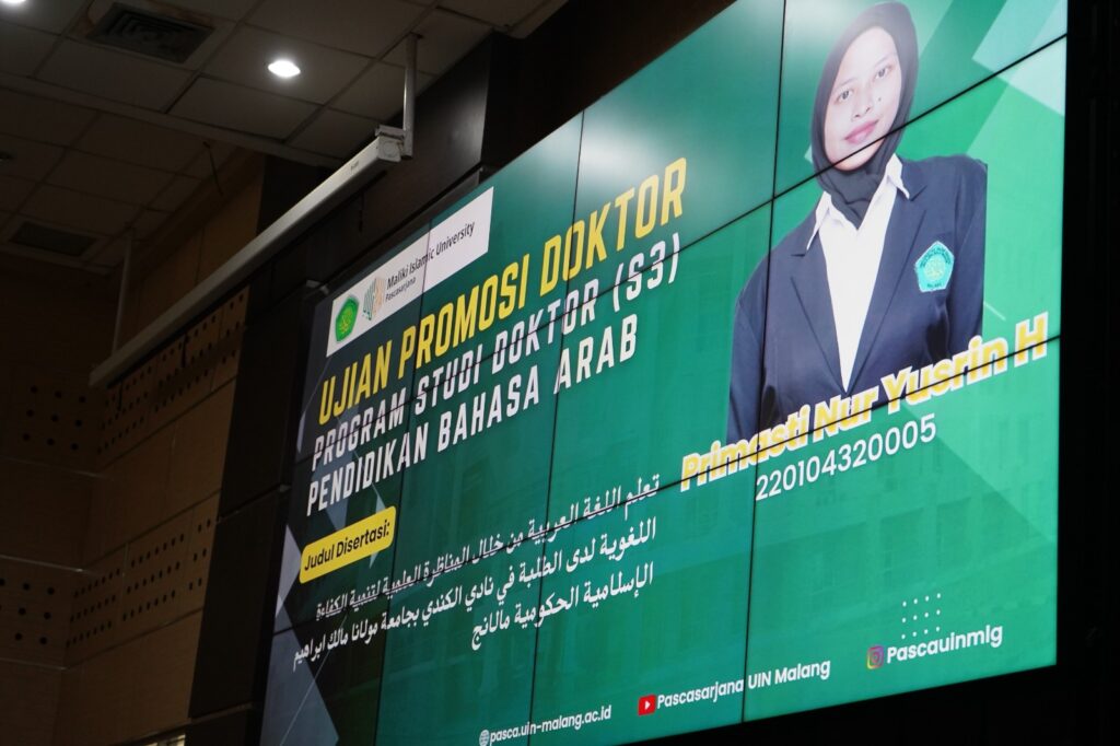 Malang — Pascasarjana UIN Maulana Malik Ibrahim Malang kembali menggelar ujian terbuka promosi doktor yang diikuti oleh Promovendus Primasti Nur Yusrin H. Dalam sidang terbuka tersebut, ia mempertahankan disertasinya yang berjudul “تعلم اللغة العربية من خلال المناظرة العلمية لتنمية الكفاءة اللغوية لدى الطلبة في نادي الكندي بجامعة مولانا مالك ابراهيم الإسلامية الحكومية مالانج”, yang mengkaji pembelajaran bahasa Arab melalui metode debat ilmiah untuk meningkatkan kompetensi kebahasaan mahasiswa.