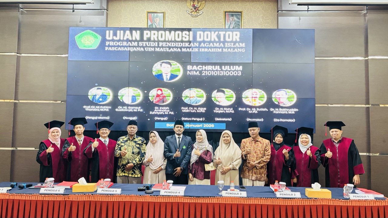 Ujian terbuka ini dipimpin oleh Prof. Dr. H. Agus Maimun, M.Pd selaku Ketua Penguji, dengan Dr. H. Nurul Yaqien, M.Pd sebagai Sekretaris Penguji. Adapun tim penguji terdiri dari Prof. Dr. M. Fahim Tharaba, M.Pd sebagai Penguji I, Dr. Hj. Samsul Susilawati, M.Pd sebagai Penguji II, dan Dr. Indah Aminatuz Zuhriyah, M.Pd sebagai Penguji III. Bertindak sebagai Promotor adalah Prof. Dr. Hj. Sutiah, M.Pd, serta Co-Promotor Drs. H. Bakhruddin Fannani, M.A., Ph.D.